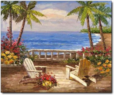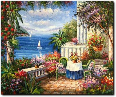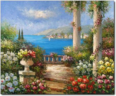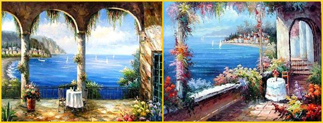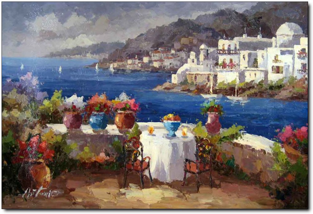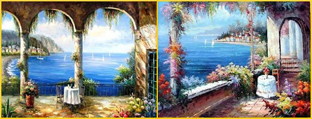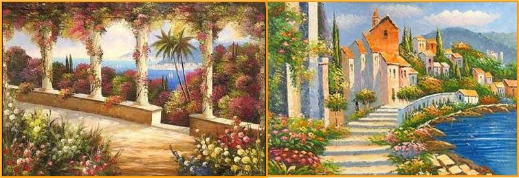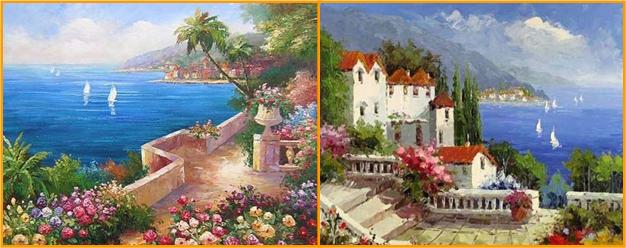 Ao navegar na Net, encontrei várias fotos de pinturas a óleo relativas a paisagens do Mediterrâneo. São paisagens que inspiram Paz e tranquilidade, onde o azul do céu se envolve com o azul do mar e onde as flores e as casas pintadas de branco são uma constante.