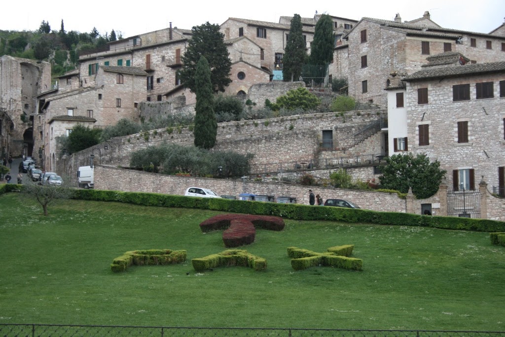 Em frente da basilica superior está um jardim lindo, onde se encontra desenhado em arbustos a palavra "PAX" (Paz). Ao fundo uma estátua que captura o momento em que, em 1204, o santo ouviu a voz de Deus dizendo-lhe para deixar a guerra e voltar para casa.