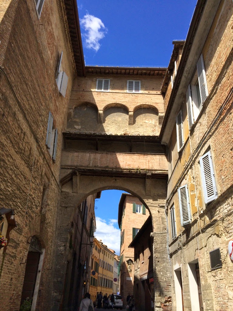 Siena está dividida em várias contradas (bairros) e os moradores têm muito orgulho na sua contrada, apresentando o símbolo ou bandeira que representa o seu bairro, nas suas janelas ou portas. Cada bairro tem uma igreja e jurisdição próprias e são elas as protagonistas da festa mais popular da cidade, o Palio. Logo ao entrar deparámos com a pequena mas linda Igreja a Chiesa della Chiocciola (Casa del Cavallo).
