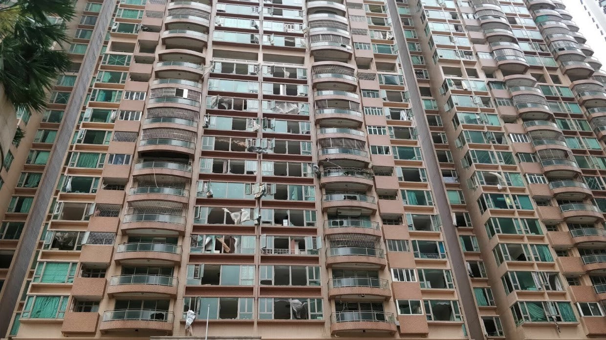 tendo o vento partido os vidros de imensas janelas. Segundo o Fábio foi assustador, o prédio abanava como se fosse um barco, ouviam-se os vidros a partir e o barulho intenso do vento. As pessoas dos apartamentos desceram para o piso zero, onde se encontra uma das garagens e ficaram lá à espera que o tufão passasse, nada mais podiam fazer.